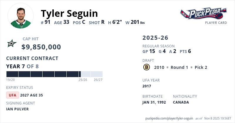 Tyler Seguin is signed to a 8 year, $78,800,000 contract with a cap hit of $9,850,000 per season, playing for the Dallas Stars. His contract expires at the end of the 2026-27 season, making Seguin an Unrestricted Free Agent.