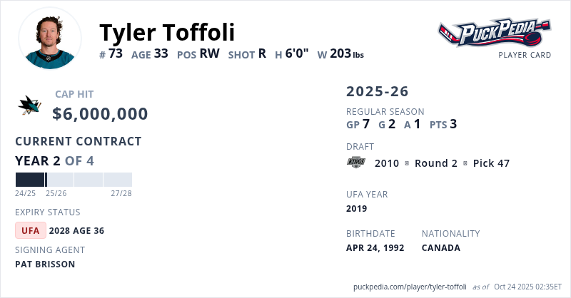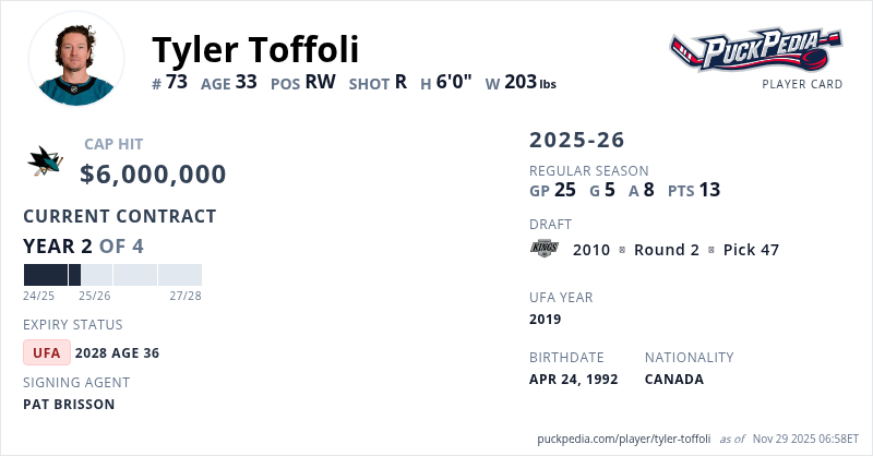 Tyler Toffoli is signed to a 4 year, $24,000,000 contract with a cap hit of $6,000,000 per season, playing for the San Jose Sharks. His contract expires at the end of the 2027-28 season, making Toffoli an Unrestricted Free Agent.