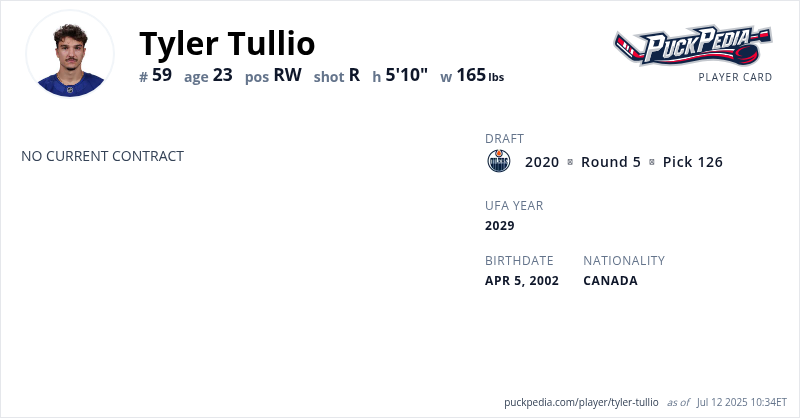 Tyler Tullio is an Unrestricted Free Agent (No Qualifying Offer). His last contract was 3 years, $2,469,999 with a cap hit of $823,333 per season. It expired at the end of the 2024-25 season.