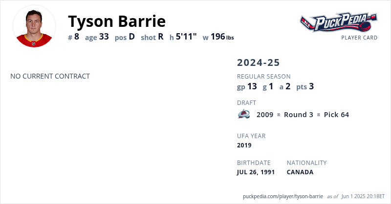 Tyson Barrie is an Unrestricted Free Agent. His last contract was 1 year, $1,250,000 with a cap hit of $1,250,000 per season. It expired at the end of the 2024-25 season.