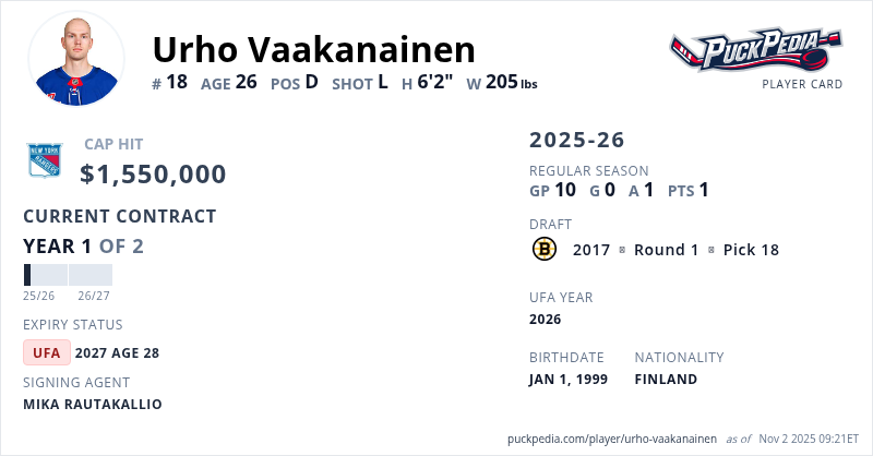Urho Vaakanainen is signed to a 2 year, $3,100,000 contract with a cap hit of $1,550,000 per season, playing for the New York Rangers. His contract expires at the end of the 2026-27 season, making Vaakanainen an Unrestricted Free Agent.