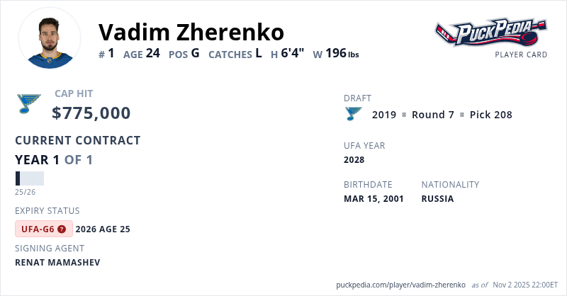Vadim Zherenko is signed to a 1 year, $775,000 contract with a cap hit of $775,000 per season, playing for the St. Louis Blues. His contract expires at the end of the 2025-26 season, making Zherenko an Unrestricted Free Agent (Group 6).