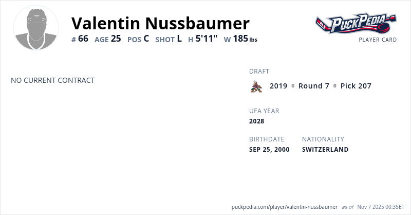 | 2023-24 | 23 | International | Switzerland (all) | 6 | 0 | 0 | 0 | 2 | ||||||||||||||||||||||
