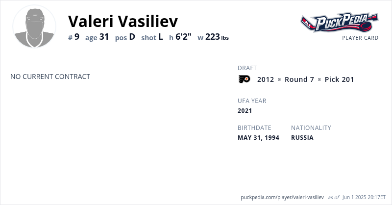| 2021-22 | 27 | VHL | Sokol Krasnoyarsk | 12 | 1 | 4 | 5 | 6 | Playoffs | 5 | 1 | 1 | 2 | 0 | ||||||||||||||||