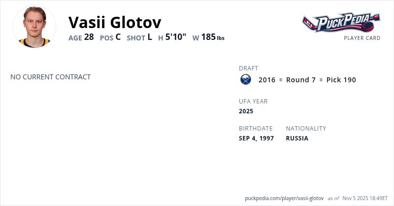 | 2019-20 | 22 | VHL | SKA-VMF St. Petersburg | 33 | 12 | 5 | 17 | 6 | Playoffs | 10 | 2 | 3 | 5 | 0 | ||||||||||||||||