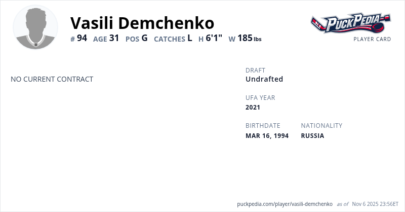 Vasili Demchenko is an Unrestricted Free Agent. His last contract was 1 year, $792,500 with a cap hit of $792,500 per season. It expired at the end of the 2020-21 season.