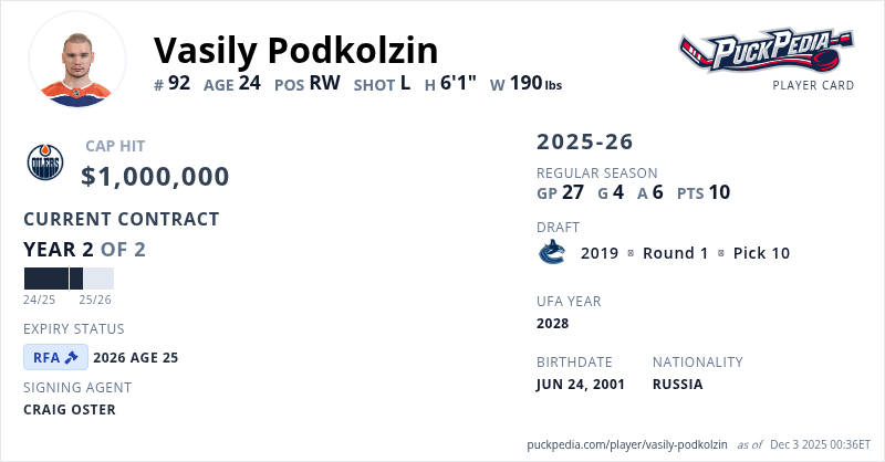 Vasily Podkolzin is signed to a 3 year, $8,850,000 contract extension with a cap hit of $2,950,000 per season. He plays for the Edmonton Oilers. His next contract begins for the 2026-27 season and expires at the end of the 2028-29 season, making him an Unrestricted Free Agent.