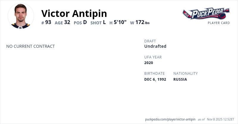 Victor Antipin is an Unrestricted Free Agent (No Qualifying Offer). His last contract was 1 year, $925,000 with a cap hit of $925,000 per season. It expired at the end of the 2017-18 season.
