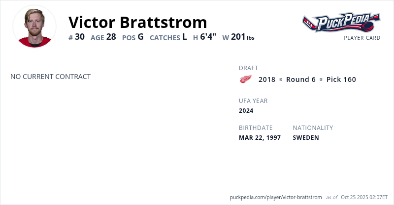 Victor Brattstrom is an Unrestricted Free Agent (Group 6). His last contract was 1 year, $750,000 with a cap hit of $750,000 per season. It expired at the end of the 2022-23 season.