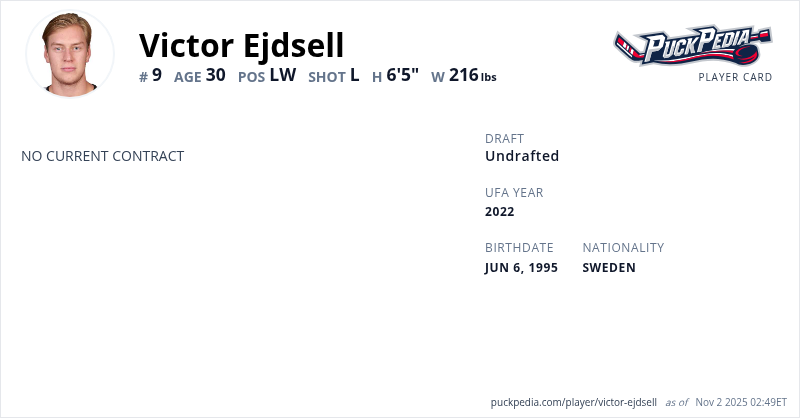 Victor Ejdsell is a Restricted Free Agent. His last contract was 2 years, $1,667,500 with a cap hit of $833,750 per season. It expired at the end of the 2018-19 season.
