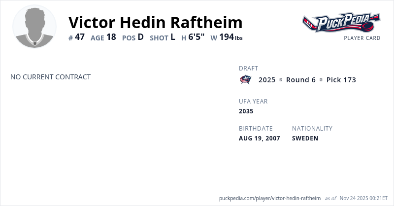 | 2025-26 | 18 | SHL | Brynäs IF | 17 | 0 | 0 | 0 | 4 | ||||||||||||||||||||||