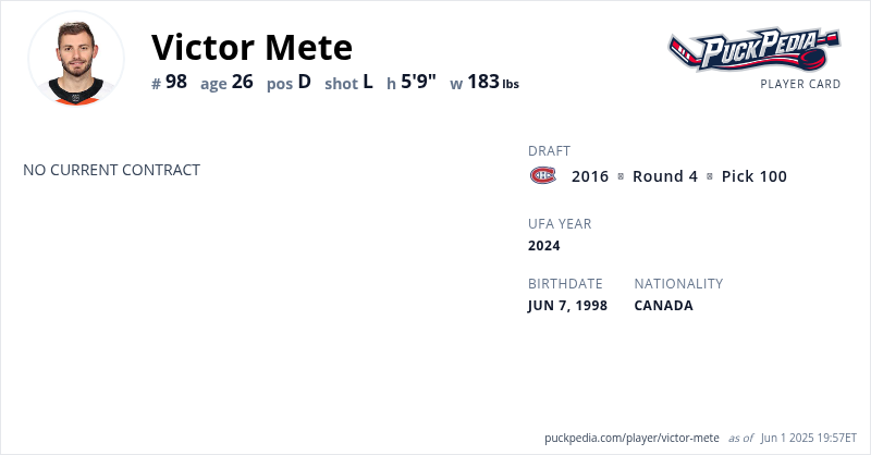 Victor Mete is an Unrestricted Free Agent (No Qualifying Offer). His last contract was 1 year, $775,000 with a cap hit of $775,000 per season. It expired at the end of the 2023-24 season.