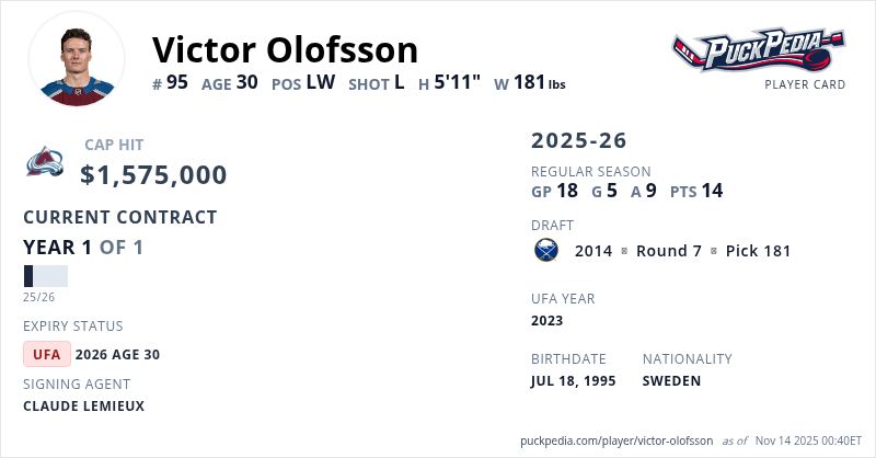 Victor Olofsson is signed to a 1 year, $1,575,000 contract with a cap hit of $1,575,000 per season, playing for the Colorado Avalanche. His contract expires at the end of the 2025-26 season, making Olofsson an Unrestricted Free Agent.