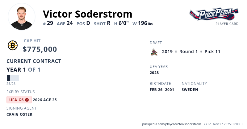 Victor Soderstrom is signed to a 1 year, $775,000 contract with a cap hit of $775,000 per season, playing for the Boston Bruins. His contract expires at the end of the 2025-26 season, making Soderstrom an Unrestricted Free Agent (Group 6).