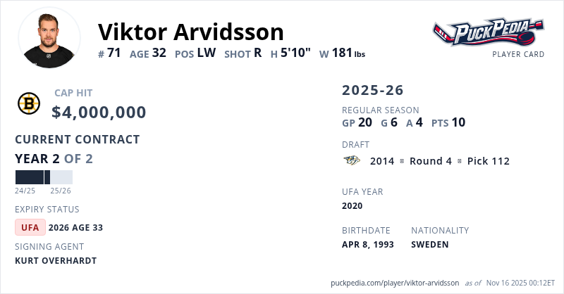 Viktor Arvidsson is signed to a 2 year, $8,000,000 contract with a cap hit of $4,000,000 per season, playing for the Boston Bruins. His contract expires at the end of the 2025-26 season, making Arvidsson an Unrestricted Free Agent.