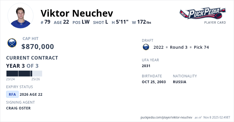 Viktor Neuchev is signed to a 3 year, $2,610,000 contract with a cap hit of $870,000 per season, playing for the Buffalo Sabres. His contract expires at the end of the 2025-26 season, making Neuchev a Restricted Free Agent.