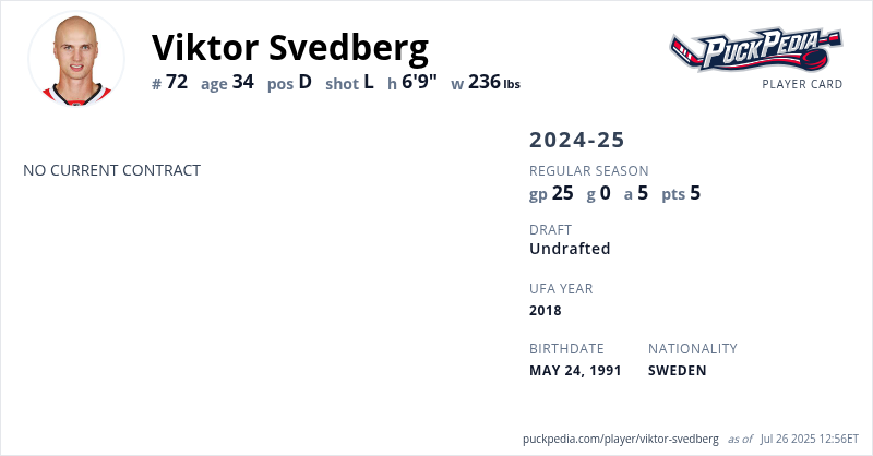 Viktor Svedberg is an Unrestricted Free Agent. His last contract was 2 years, $1,500,000 with a cap hit of $750,000 per season. It expired at the end of the 2017-18 season.