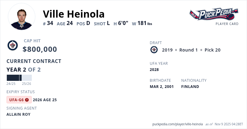 Ville Heinola is signed to a 2 year, $1,600,000 contract with a cap hit of $800,000 per season, playing for the Winnipeg Jets. His contract expires at the end of the 2025-26 season, making Heinola an Unrestricted Free Agent (Group 6).