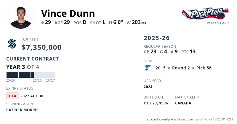 Vince Dunn is signed to a 4 year, $29,400,000 contract with a cap hit of $7,350,000 per season, playing for the Seattle Kraken. His contract expires at the end of the 2026-27 season, making Dunn an Unrestricted Free Agent.
