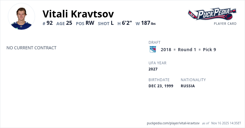Vitali Kravtsov is an Unrestricted Free Agent (Group 6). His last contract was 1 year, $775,000 with a cap hit of $775,000 per season.