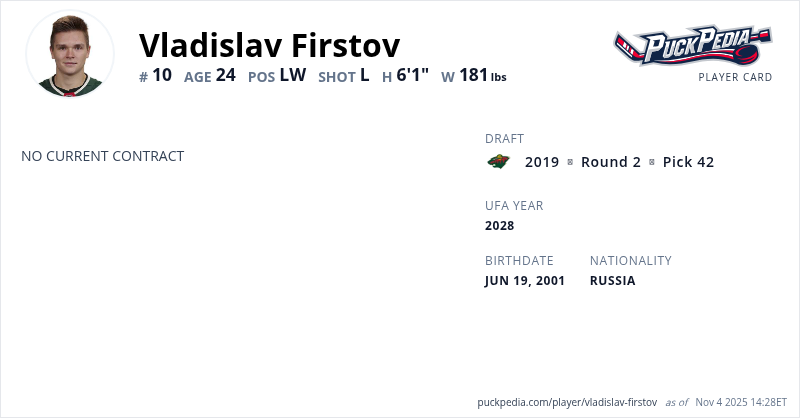Vladislav Firstov is a Restricted Free Agent. His last contract was 3 years, $2,775,000 with a cap hit of $925,000 per season. It expired at the end of the 2024-25 season.