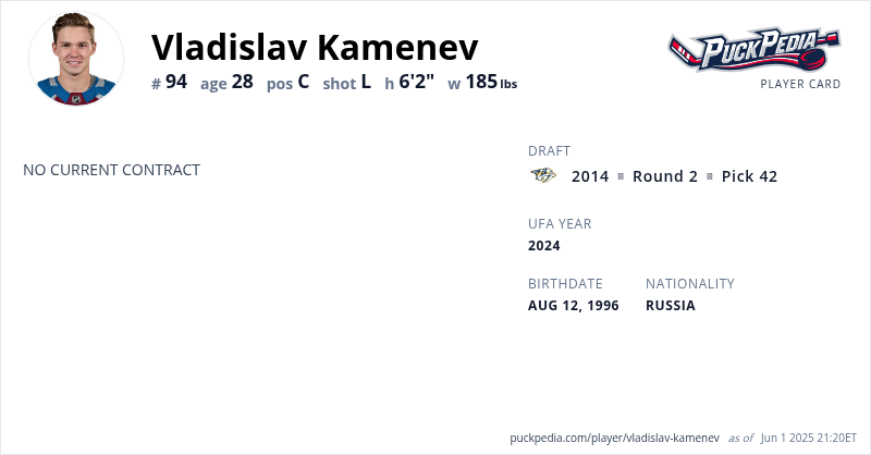 Vladislav Kamenev is a Restricted Free Agent. His last contract was 1 year, $750,000 with a cap hit of $750,000 per season. It expired at the end of the 2019-20 season.