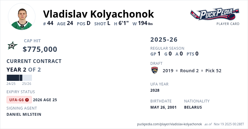 Vladislav Kolyachonok is signed to a 2 year, $1,550,000 contract with a cap hit of $775,000 per season, playing for the Dallas Stars. His contract expires at the end of the 2025-26 season, making Kolyachonok an Unrestricted Free Agent (Group 6).
