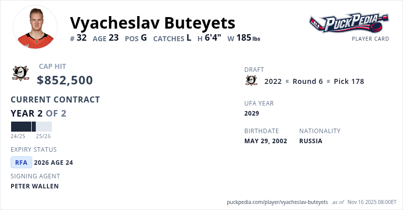 Vyacheslav Buteyets is signed to a 2 year, $1,705,000 contract with a cap hit of $852,500 per season, playing for the Anaheim Ducks. His contract expires at the end of the 2025-26 season, making Buteyets a Restricted Free Agent.