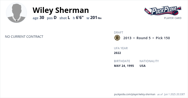 Wiley Sherman is an Unrestricted Free Agent (No Qualifying Offer). His last contract was 2 years, $1,585,000 with a cap hit of $792,500 per season. It expired at the end of the 2019-20 season.