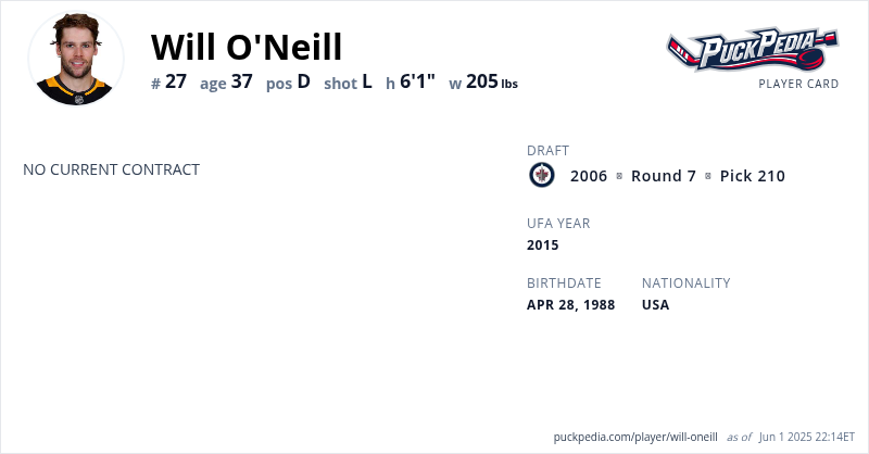 Will O'Neill is an Unrestricted Free Agent. His last contract was 2 years, $1,225,000 with a cap hit of $612,500 per season. It expired at the end of the 2017-18 season.