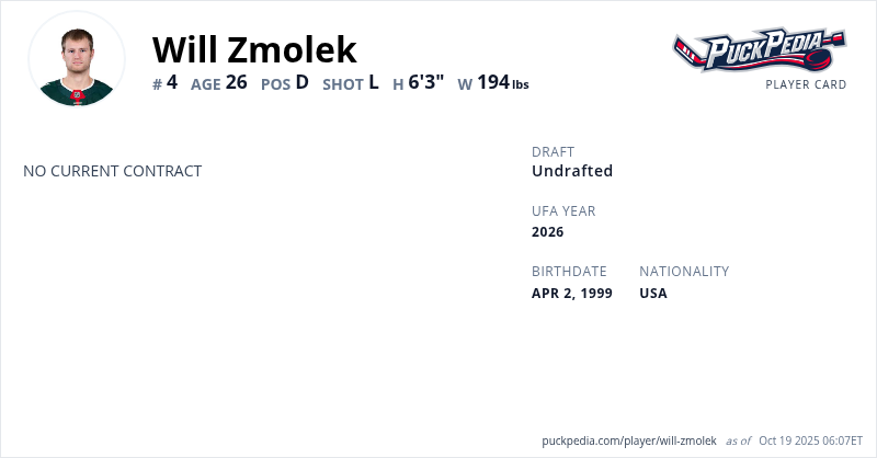 Will Zmolek is an Unrestricted Free Agent (No Qualifying Offer). His last contract was 1 year, $920,000 with a cap hit of $920,000 per season. It expired at the end of the 2023-24 season.