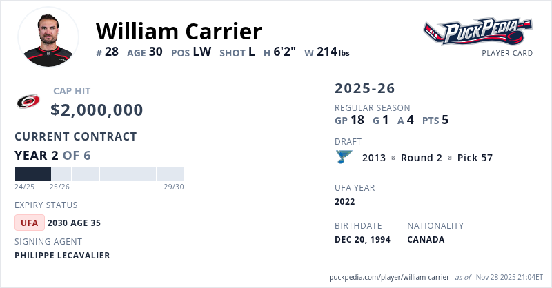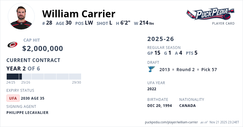 William Carrier is signed to a 6 year, $12,000,000 contract with a cap hit of $2,000,000 per season, playing for the Carolina Hurricanes. His contract expires at the end of the 2029-30 season, making Carrier an Unrestricted Free Agent.