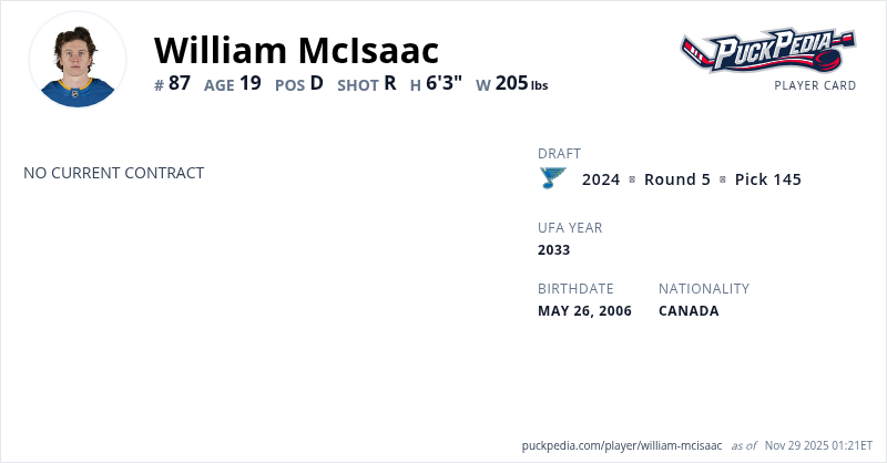 | 2023-24 | 17 | WHL | Spokane Chiefs | 67 | 6 | 21 | 27 | 70 | Playoffs | 4 | 0 | 1 | 1 | 0 | ||||||||||||||||