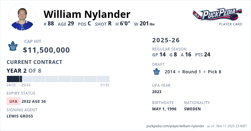William Nylander is signed to a 8 year, $92,000,000 contract with a cap hit of $11,500,000 per season, playing for the Toronto Maple Leafs. His contract expires at the end of the 2031-32 season, making Nylander an Unrestricted Free Agent.