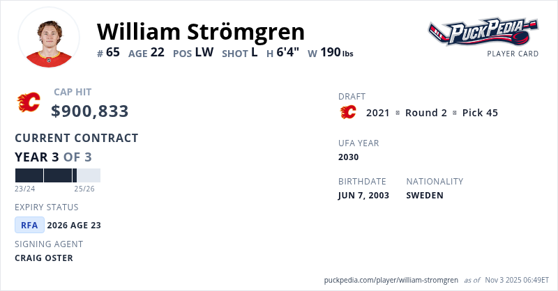 William Strömgren is signed to a 3 year, $2,702,499 contract with a cap hit of $900,833 per season, playing for the Calgary Flames. His contract expires at the end of the 2025-26 season, making Strömgren a Restricted Free Agent.