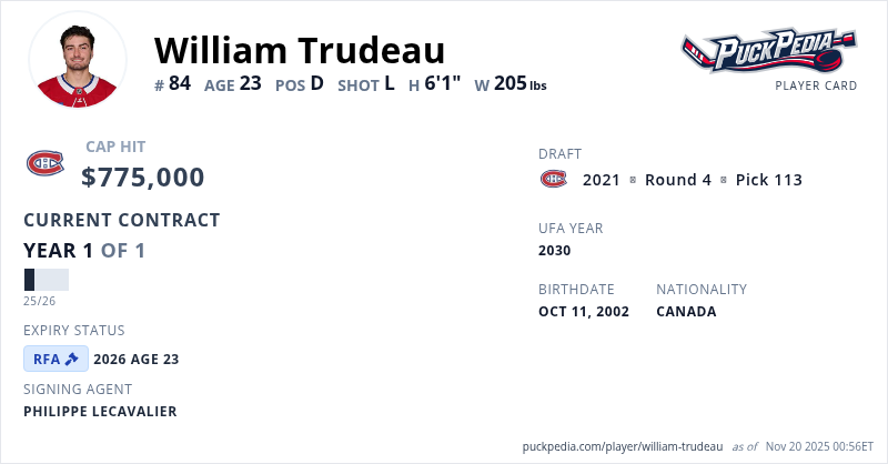 William Trudeau is signed to a 1 year, $775,000 contract with a cap hit of $775,000 per season, playing for the Montreal Canadiens. His contract expires at the end of the 2025-26 season, making Trudeau a Restricted Free Agent.