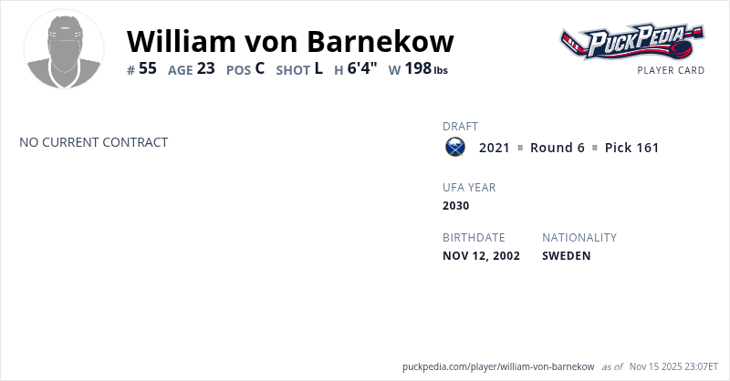 | 2024-25 | 22 | SHL | Malmö Redhawks | 52 | 5 | 5 | 10 | 14 | Playoffs | 8 | 0 | 0 | 0 | 0 | ||||||||||||||||