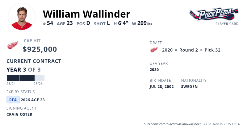 William Wallinder is signed to a 3 year, $2,775,000 contract with a cap hit of $925,000 per season, playing for the Detroit Red Wings. His contract expires at the end of the 2025-26 season, making Wallinder a Restricted Free Agent.