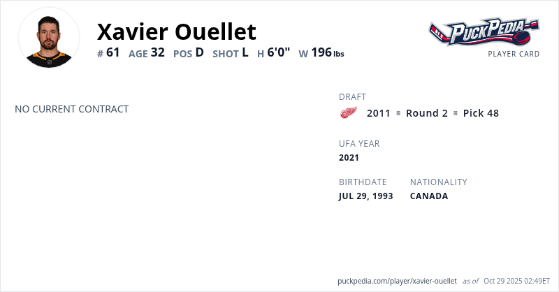 Xavier Ouellet is an Unrestricted Free Agent. His last contract was 2 years, $1,525,000 with a cap hit of $762,500 per season. It expired at the end of the 2023-24 season.
