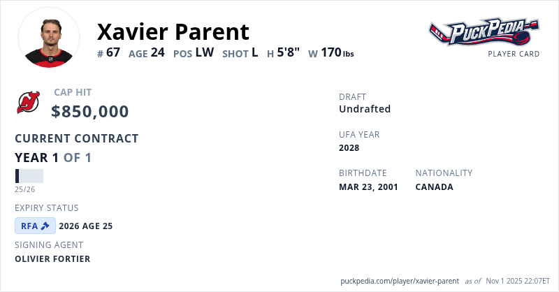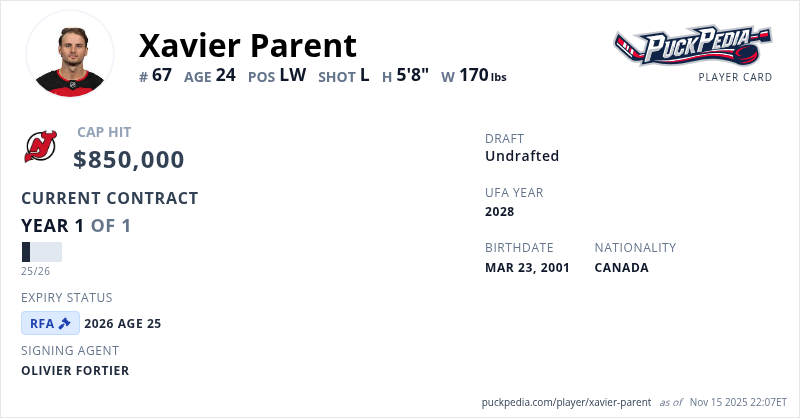 Xavier Parent is signed to a 1 year, $850,000 contract with a cap hit of $850,000 per season, playing for the New Jersey Devils. His contract expires at the end of the 2025-26 season, making Parent a Restricted Free Agent.