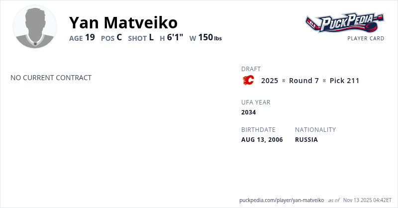 | 2025-26 | 19 | MHL | Krasnaya Armiya Moskva | 22 | 9 | 14 | 23 | 6 | ||||||||||||||||||||||