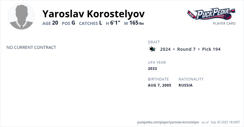 | 2025-26 | 20 | MHL | SKA-1946 St. Petersburg | 5 | 3.37 | 0.891 | 0 | |||||||||||||||||||||||