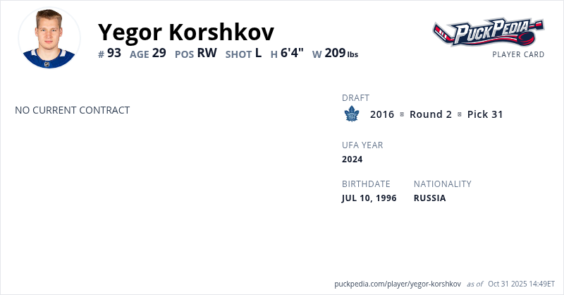 Yegor Korshkov is a Restricted Free Agent. His last contract was 2 years, $1,850,000 with a cap hit of $925,000 per season. It expired at the end of the 2020-21 season.