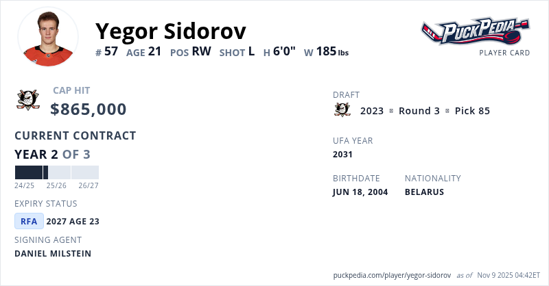Yegor Sidorov is signed to a 3 year, $2,595,000 contract with a cap hit of $865,000 per season, playing for the Anaheim Ducks. His contract expires at the end of the 2026-27 season, making Sidorov a Restricted Free Agent.