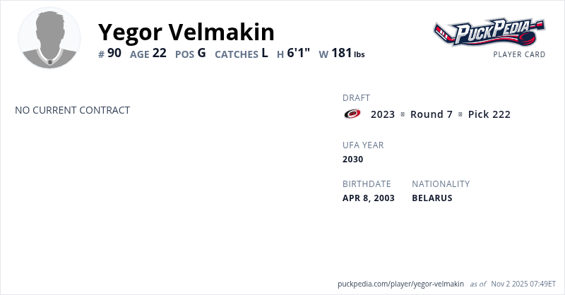 | 2025-26 | 22 | VHL | Dynamo St. Petersburg | 6 | 2.46 | 0.926 | 0 | |||||||||||||||||||||||