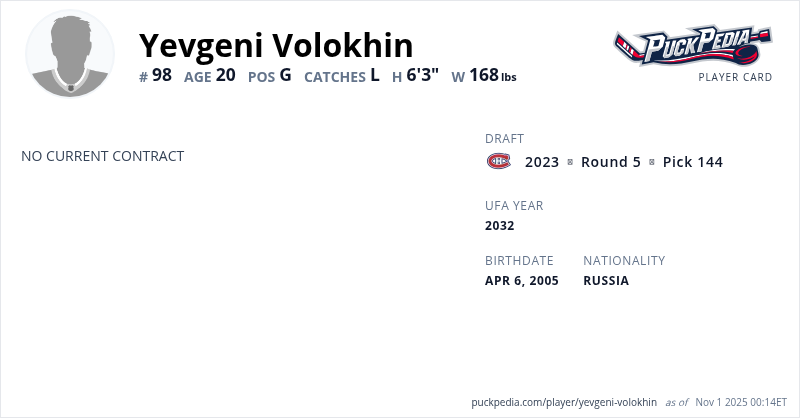 | 2023-24 | 18 | VHL | Yugra Khanty-Mansiysk | 0 | 0.000 | 0 | ||||||||||||||||||||||||