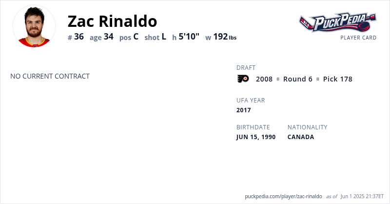 Zac Rinaldo is an Unrestricted Free Agent. His last contract was 1 year, $750,000 with a cap hit of $750,000 per season. It expired at the end of the 2021-22 season.