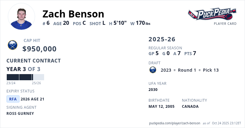 Zach Benson is signed to a 3 year, $2,850,000 contract with a cap hit of $950,000 per season, playing for the Buffalo Sabres. His contract expires at the end of the 2025-26 season, making Benson a Restricted Free Agent.