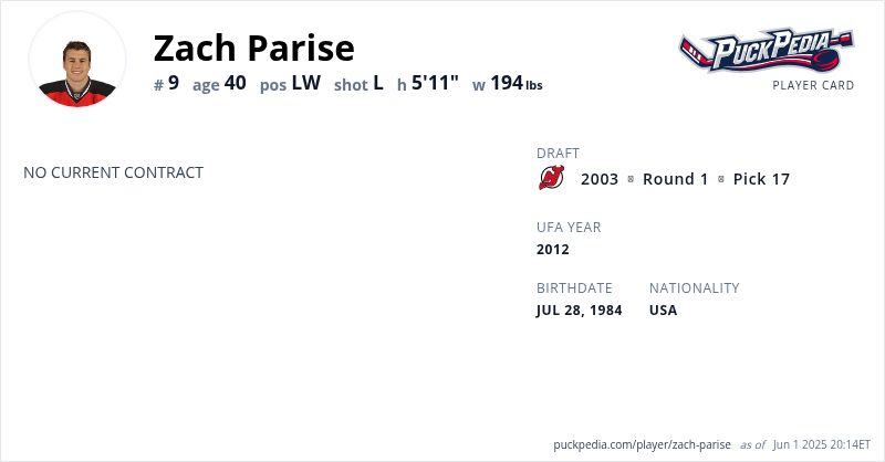 Zach Parise is an Unrestricted Free Agent. His last contract was 1 year, $825,000 with a cap hit of $825,000 per season. It expired at the end of the 2023-24 season.