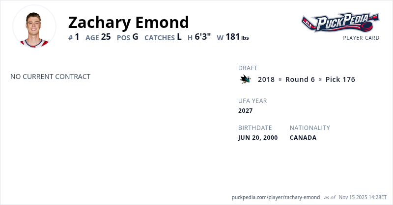 Zachary Emond is an Unrestricted Free Agent (No Qualifying Offer). His last contract was 3 years, $2,360,001 with a cap hit of $786,667 per season. It expired at the end of the 2022-23 season.